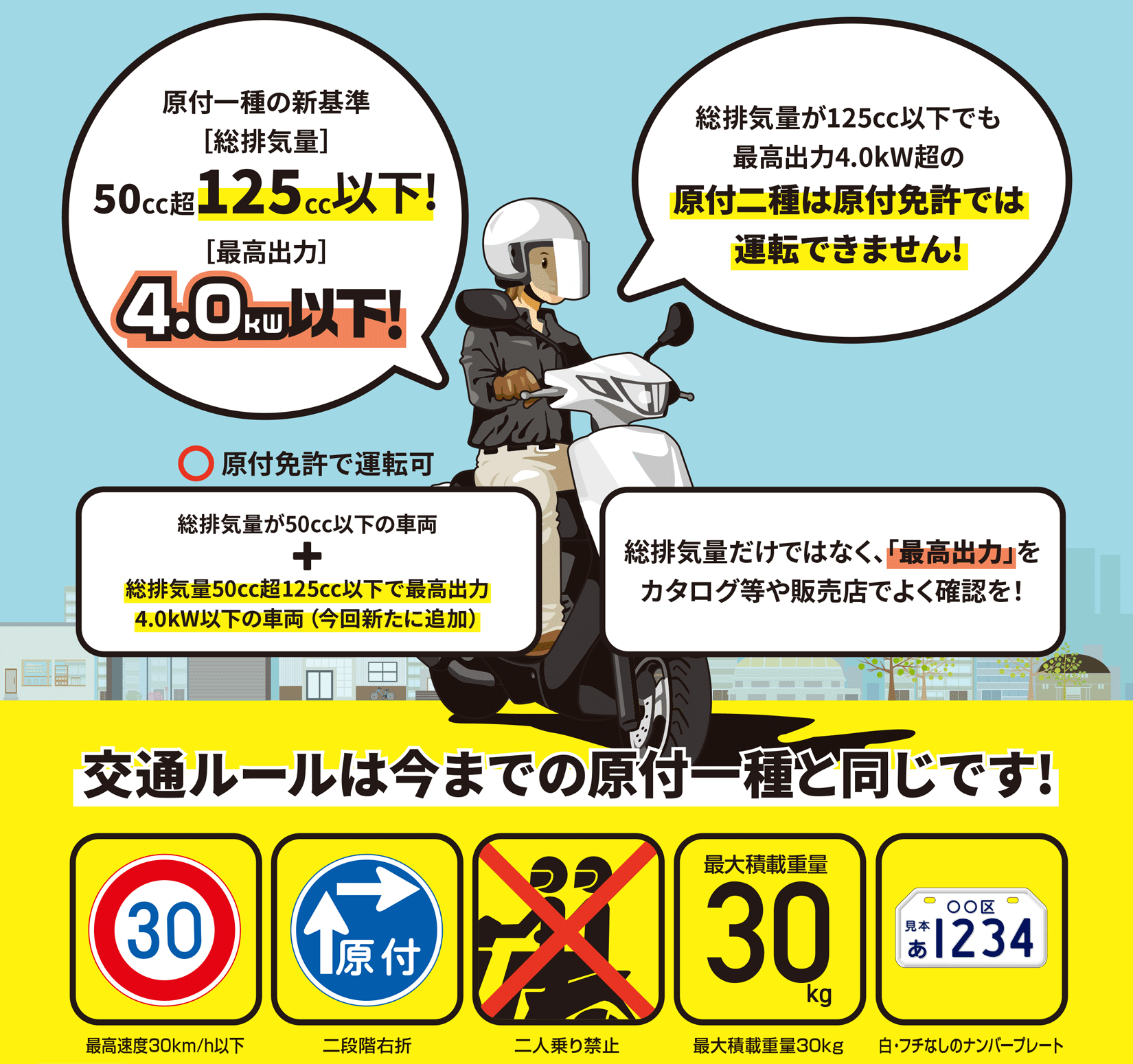 2025.4.1から原付免許で運転できる車両の基準が改正されました。新しい基準では原付免許で乗れる車両は総排気量125cc以下の二輪車で最高出力を4.0キロワット以下に制御したもの(新基準原付)です。