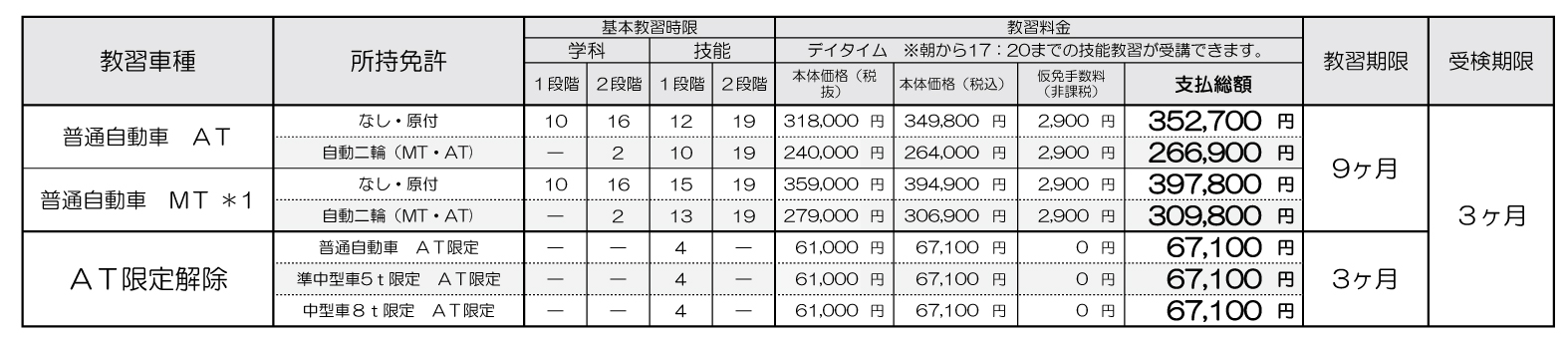 ※フルタイム(全時間帯の技能教習を受講希望の方)は、別途税込16,500円(限定解除の場合は税込11,000円)が必要となります。
