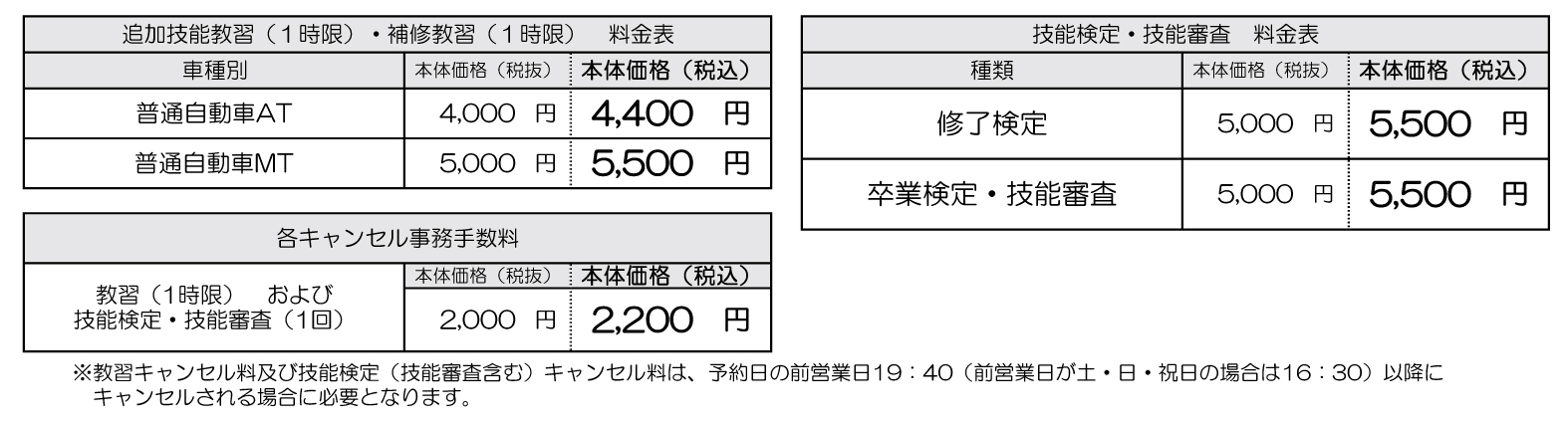 お客様のご都合で技能教習又は技能検定の予約日の前日で学校が定める時刻以降にキャンセルされた場合はキャンセル料(2,200円(税込)/1技能)が発生します。