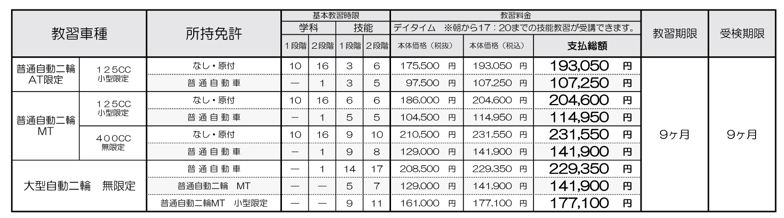 | 普通二輪(AT) | ー | ー | 9時限 | 7時限 |