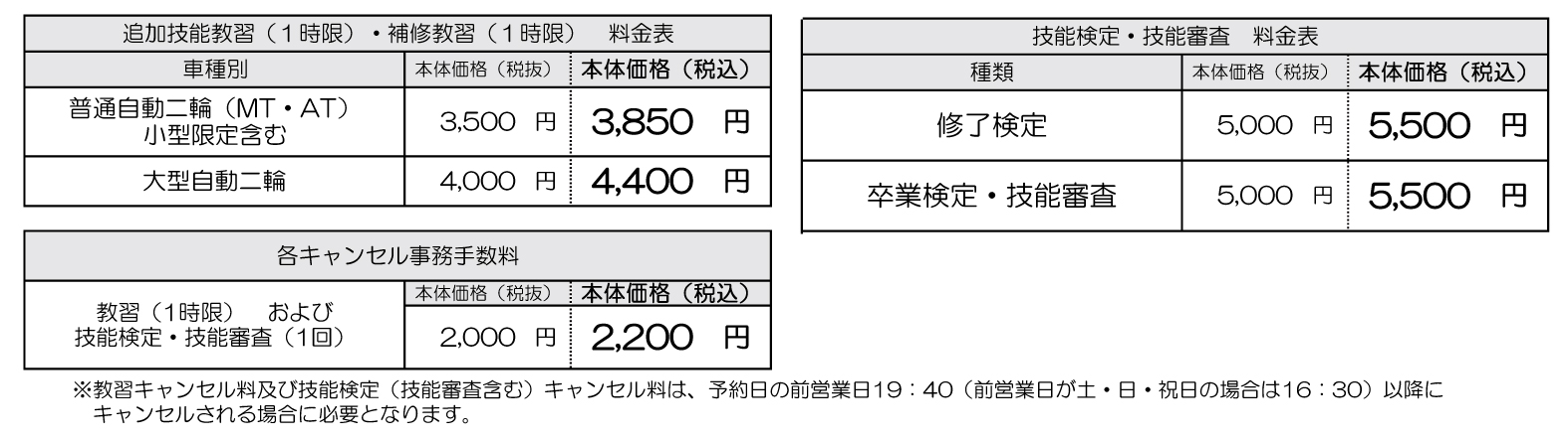 二輪車 :卒業検定/5,500円(税込) - 仮免許学科試験がある車種で不合格の場合は再受験料が1回につき1,800円(非課税)が発生します。