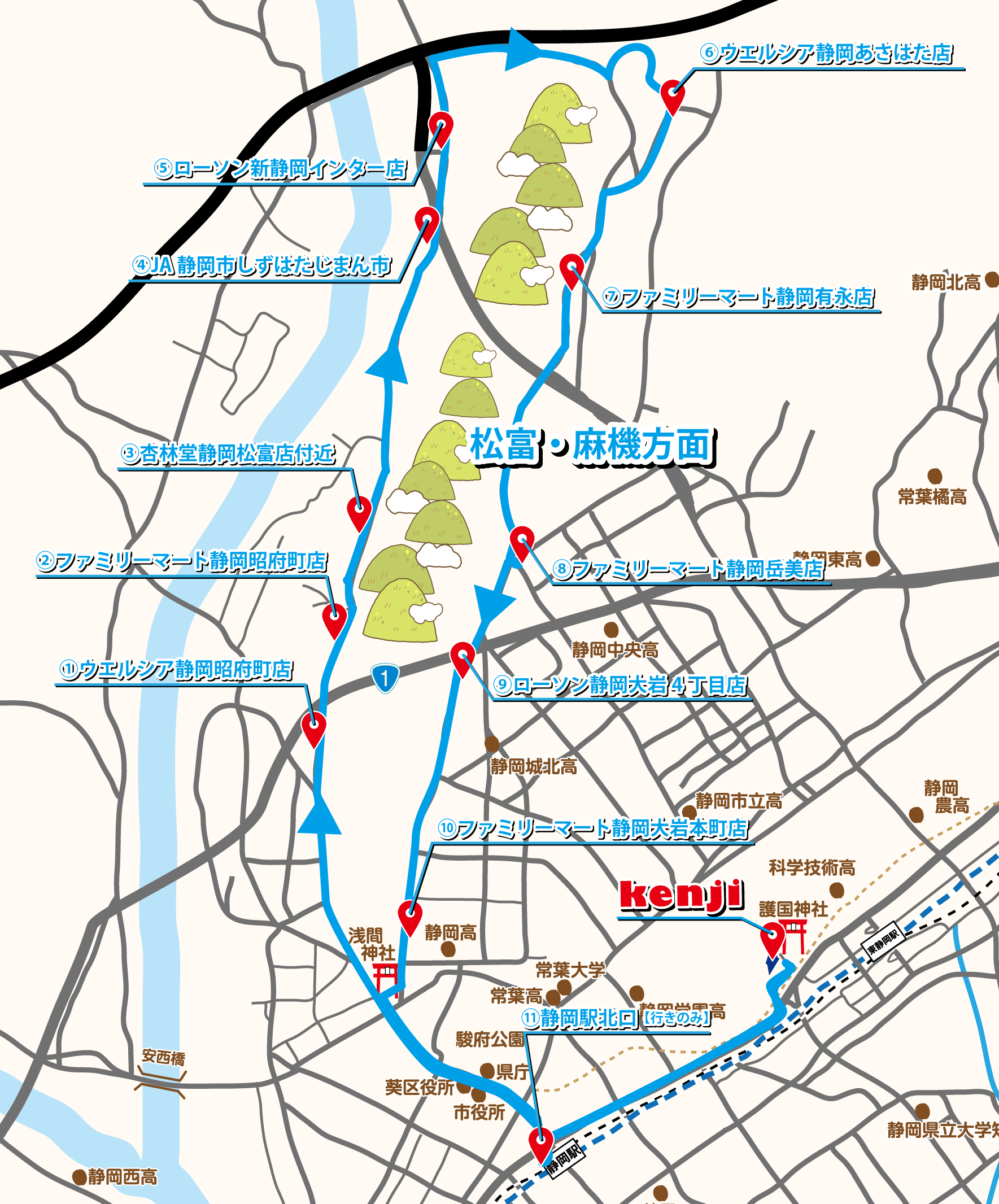 ・その他時間帯において、松富方面の方はご自宅の場所によっては《安倍口方面》でも近くを通る場合もございます。 ・9時限目以降の【帰り】は、静岡駅までとなります。《静岡駅・高松方面》をご確認ください。 |