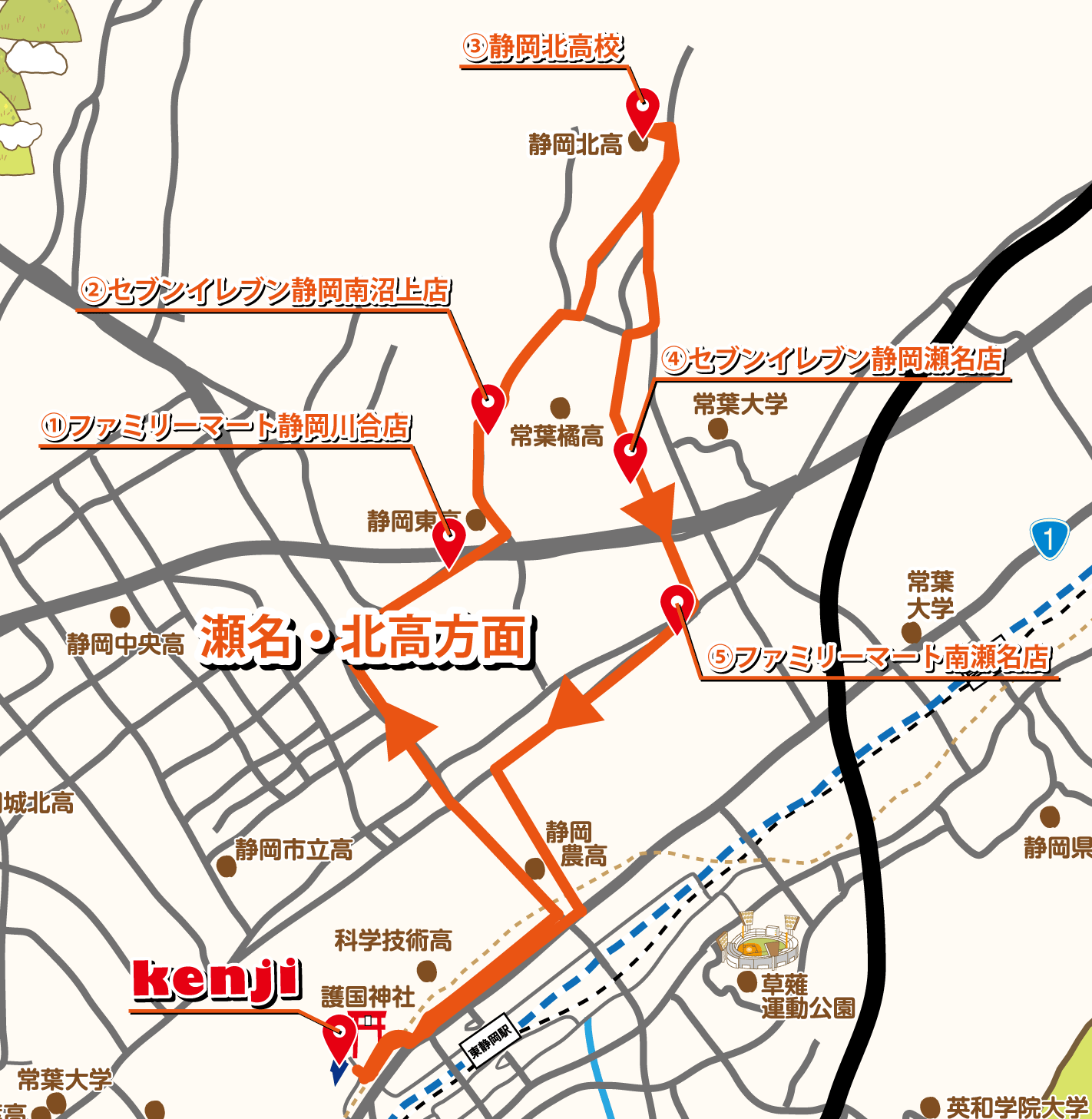 ③静岡北高校 | ④セブンイレブン 静岡瀬名店 |
